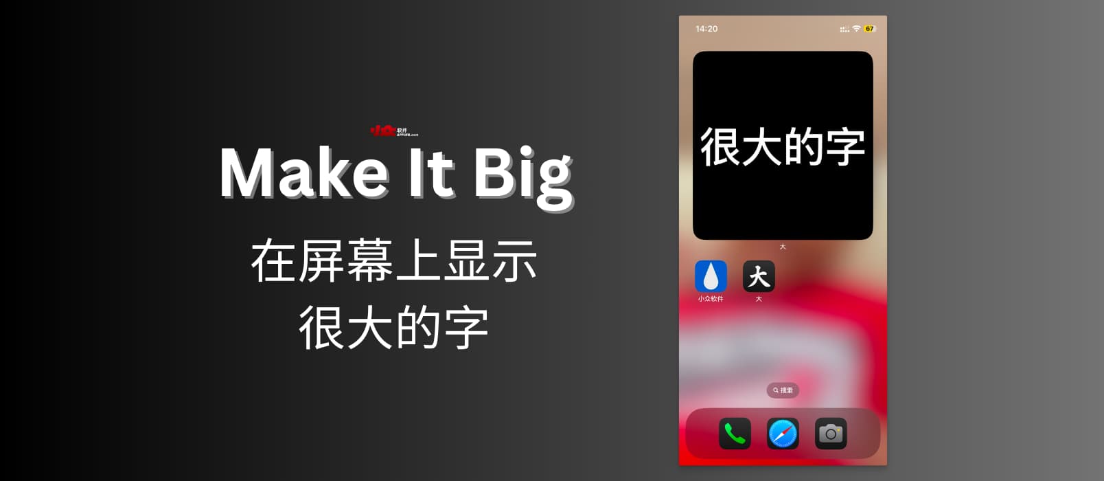 Make It Big 是一款支持 iPhone、iPad 的大字显示应用,你输入什么字,它就显示什么字,很大,占满屏幕。还支持桌面小组件、锁屏小组件,晃一晃手机闪屏,简单、免费。@Appinn
